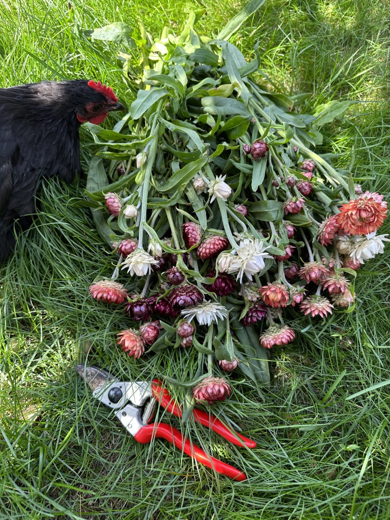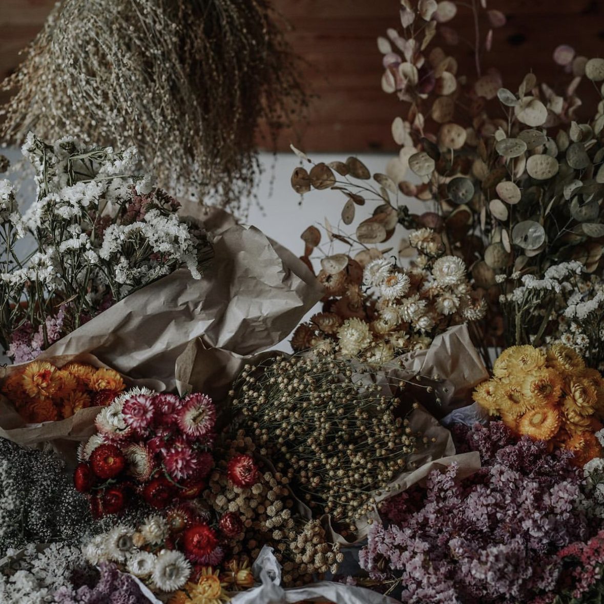 Vem har sagt att närodlade blommor bara hör sommaren till? Jag har valt att avvara en del av min odlingsyta till eterneller och andra torktåliga blommor. Jag skördar blommorna, hänger stjälkarna på tork, sveper varsamt in dom torkade buntarna i papper och stoppar sedan undan en del av sommarens skörd i mina gömmor. På så vis finns det gott om egenodlat blomstermaterial att plocka fram även under höst och vinter. Torkade blommor är inte bara miljövänligt utan även underbart vackert. Inte sant?